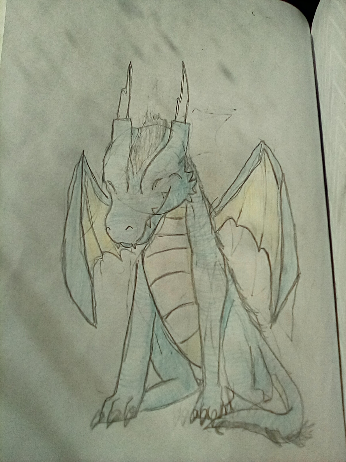 This one is lightly colored, and the picture was taken in the sunlight with leaves casting shadows upon the page. I was going to include a hand petting the dragon, but I didn't want to obscure its head any, and it's one less hand to draw. 10